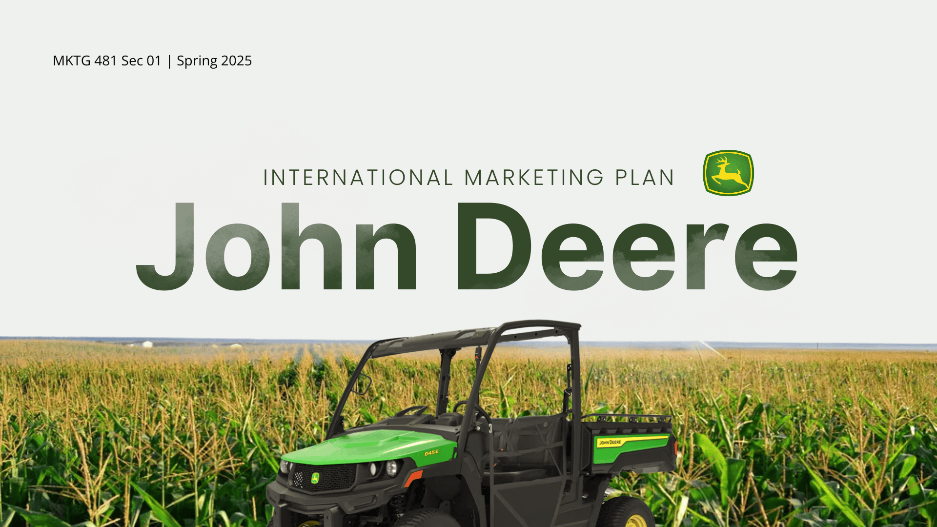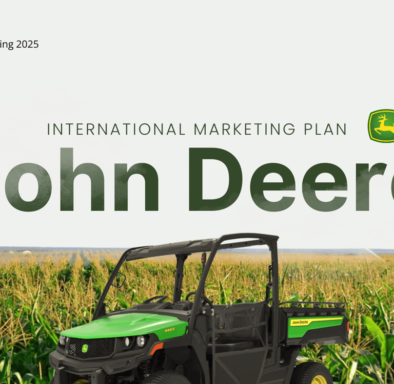 led a group project to create a international marketing plan for the company, john deere, to enter the north african markets of egypt, algeria, morocco, and tunisia. in addition to coordinating group roles, deadlines, and deliverables, i also created the visual elements of the project, including the slide deck.